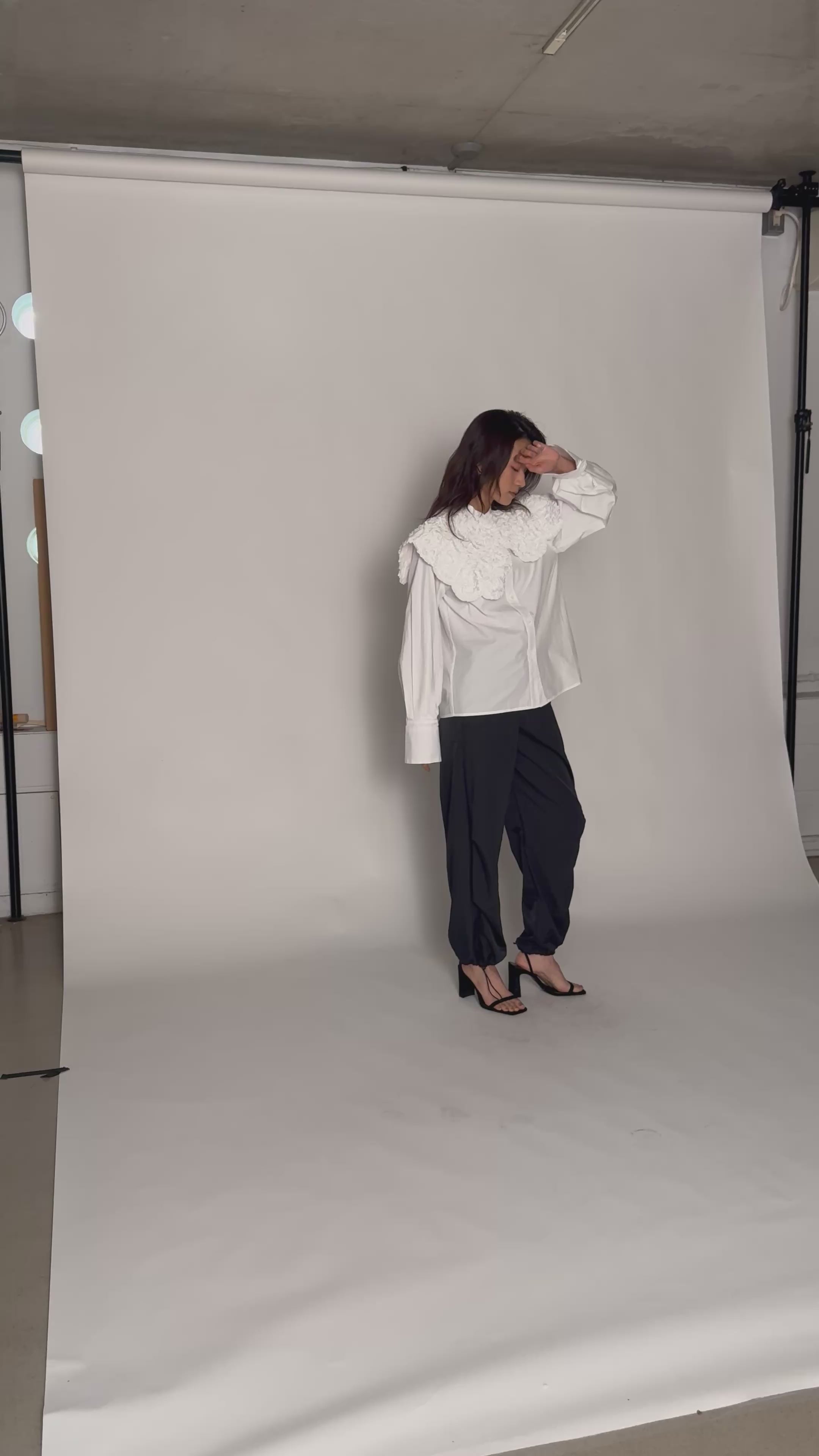立体的なフリル襟はハンドクラフトのような繊細さを感じさせつつ、構築的なシルエットで存在感を放ちます。ややハリ感のあるコットン素材を使用しているため、1枚で主役になるだけでなく、レイヤードのインナーとしても活躍。