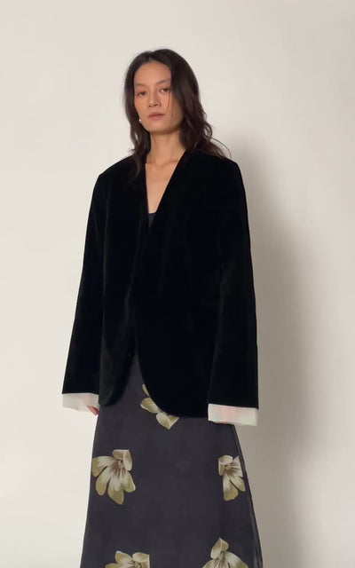 しっとりとしたベルベットの光沢と、控えめなクラシックさを宿したノーカラーデザインが魅力のジャケット。カーディガン感覚でラフに羽織っても、シャープなパンツと合わせてモードに決めても。気負いすぎないエレガンスを体現するジャケットです。